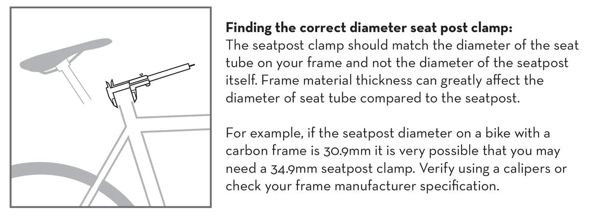 Frames may vary slightly from the nominal diameters due to tolerances and paint thickness. Clamps will fit on frames that are within +/- 0.5mm of specified size. For example, a 34.9mm clamp will fit frames with a seat tube measuring from 34.4mm to 35.4mm in diameter.